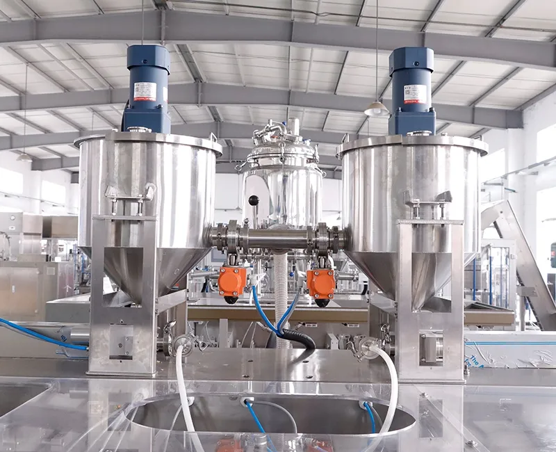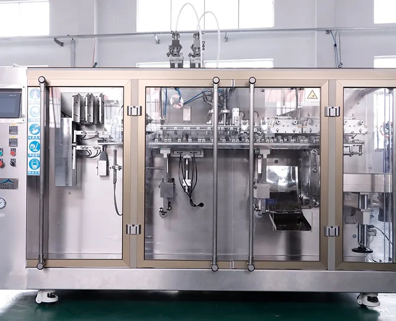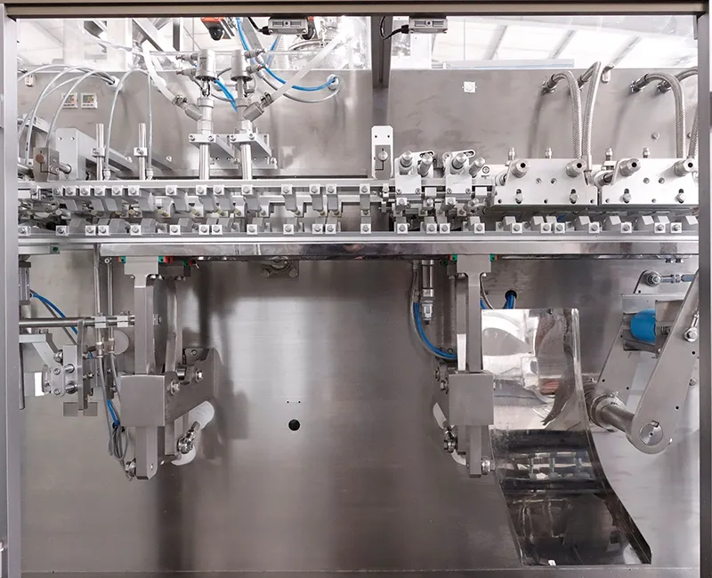 Estas envasadoras de bolsas prefabricadas están diseñadas para productos de pequeño volumen, generalmente entre 10 y 200ml. Con dos boquillas de llenado que funcionan en paralelo, se procesan dos bolsas en cada ciclo en lugar de una sola, lo que aumenta la producción. En la práctica, la eficiencia puede ser hasta un 80% mayor que con las envasadoras de una boquilla, lo que permite procesar mayores volúmenes en el mismo tiempo de producción. Se utilizan bolsas preformadas para el envasado, y el proceso abarca la recogida, apertura, llenado y sellado de la bolsa en un ciclo sincronizado. Estas envasadoras de bolsas de dos boquillas se utilizan ampliamente para envasar cosméticos, alimentos, productos farmacéuticos, suplementos alimenticios, comida para mascotas, etc.