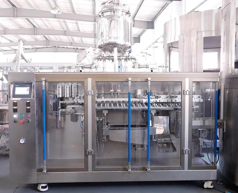Pinzas para bolsas, panel de control HMI, tanque de producto líquido, sistema de transporte