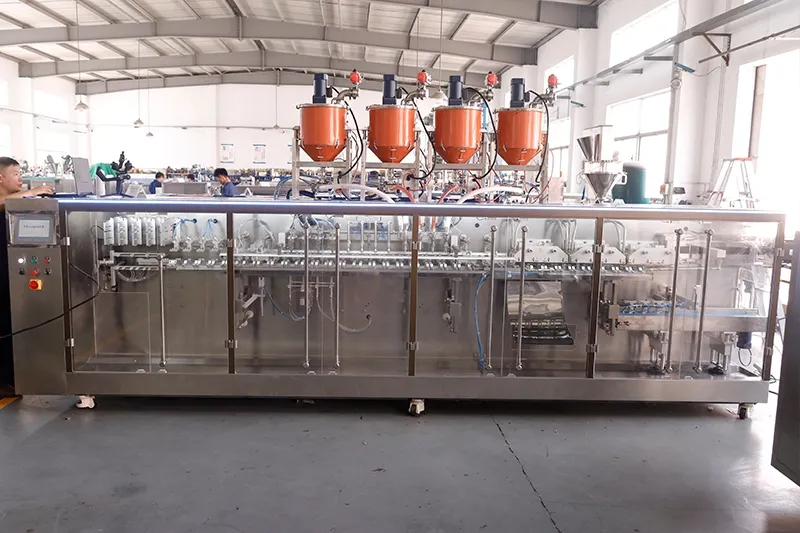 - Cuando cuatro carriles (cuatro boquillas) funcionan simultáneamente, se pueden envasar muchas más bolsas al día en comparación con una línea estándar de dos carriles. En la producción real, este tipo de configuración puede superar fácilmente las 100,000 bolsas diarias sin llevar la máquina al límite.